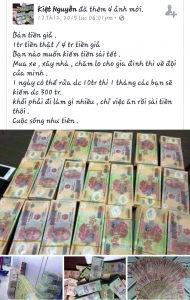 Facebook Ông chủ buôn rao bán tiền giả như sau: “Muốn có gái đẹp thì trước tiên bạn phải có nhiều tiền. Muốn có nhiều tiền thì hãy liên hệ với chúng tôi, tôi sẽ giúp bạn thực hiện điều đó”